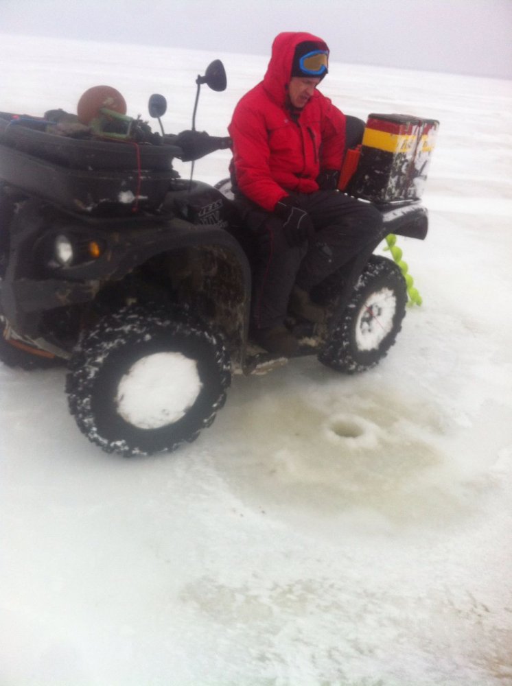На лёд выезжали на двух квадроциклах,лёд достаточной толщины что бы держать такую технику,доезжали до глубин в 7-8 метров,лёд вполне сносный,но не буду утверждать что он повсеместно такой.Людей на море впринципе ещё нет,все остерегаются ненадёжного льда...вокруг только белое безмолвие и ветер,ветер,ветер...точней ветрище!!!Береговую линию там где меляки и болота отпустило ещё в пятницу и выезд с крепкого льда обернулся целым приключением по вызволению техники из плена крошащегося льда,воды и жижы из ила...Поупражнялись на славу,до сих пор болит каждая мышца тела вплоть до кончиков пальцев