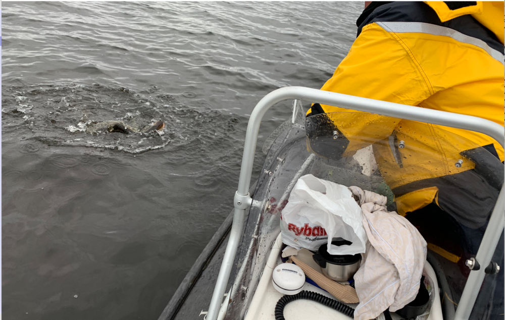 Третье: Мы настолько бодро тягали щук, что егерь Саша был вынужден подсачеком брать двух щук одновременно.