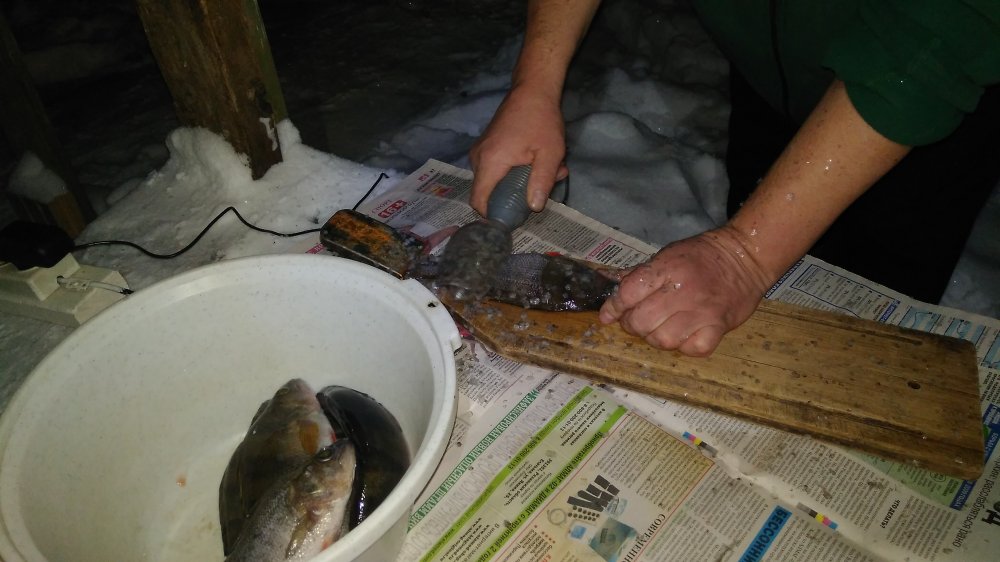 узнаЮ его по рыбочистке :D...а ещё говорят-чешуя из-под неё не летит ;),весь стол в чешуе8-),насколько глаз хватает!:D даже снег усыпали ей:)...на 2-м фото...