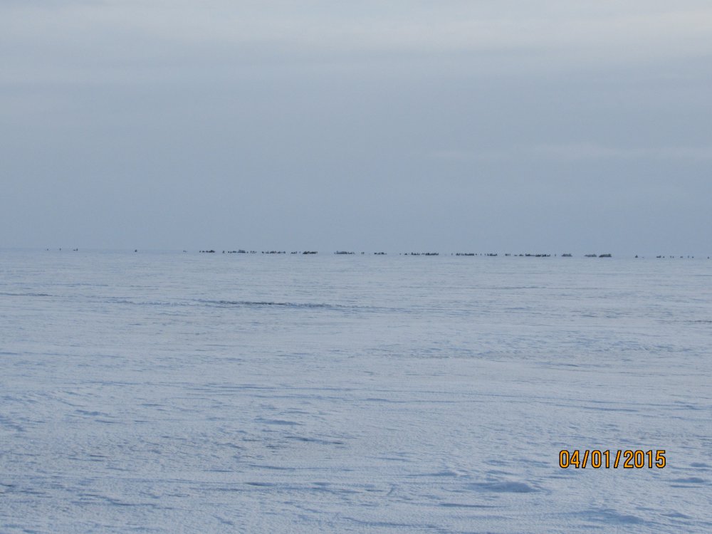 8-го, после завтрака старт. Точку, что Илья Коптевский на фишинге озвучил, выставил в навигаторе и вперед. Ближе к месту вижу, что рыбачки сместились от нее в сторону заповедника. Встал немного в стороне от первой группы. Пробурился, глубина где-то 5,5 метра. Ставлю любимы Виб и начинаю раскачивать лунку. Пусто. Сместившись метро на 100, получаю первую поклевку и вот нано-судак на льду. Аккуратно снимаю и обратно его. Дальше тихо. Перестановки результата не дали. Поехал в сторону второй кучи. Встал между ней и небольшой группой с подушкой и несколькими снежиками (наверно это и были Веселый с Коптевским). Через какое-т время замечаю знакомый снежик с санками. Решил подъехать. Так и есть – это китобои Володя Худой с Андроном. Поздоровался. Приколол один момент. Стоим с Володей метрах в 15-20 от Андрона беседуем. Тут «Худой» говорит, что у Андрона поклевка. Но я не вижу, что б он тащил рыбу. Андрон сидит и медленно раскачивает-раскачивает. Но меньше чем через минуту околокилошник уже на льду. Это я о чем? Да то что от опытного взгляда китобоя не то что выловленная рыба, даже поклевка не пройдет мимо. Что б не создавать ажиотаж отъехал от них и начал разбуривать свой пятак. Сначала было тихо, но на одной из лунок получаю короткий резкий ударчик. И вот первый зачетный судачек на льду. Через минуту-две достаю второго, чуток побольше. Смотрю, что куча потихоньку приближается ко мне. На очередной лунке достаю малыша. И вот я уже сижу в середине толпы. Мимо меня идет знакомый силуэт с палочкой. Так это Роберт Васильевич тоже весь в поиске. Постояли, перекинусь парой фраз, вспомнили декабрьскую поездку на КУ, пожелали друг другу… и разошлись. Так как на вечер заказана сауна, то принимаю решение сваливать к девчонкам. Обратно ехал мористее, там на льду снега было больше, чем ближе к берегу.