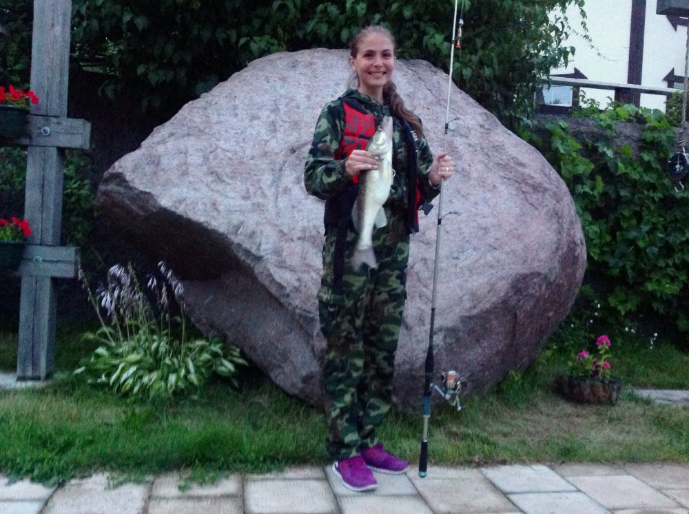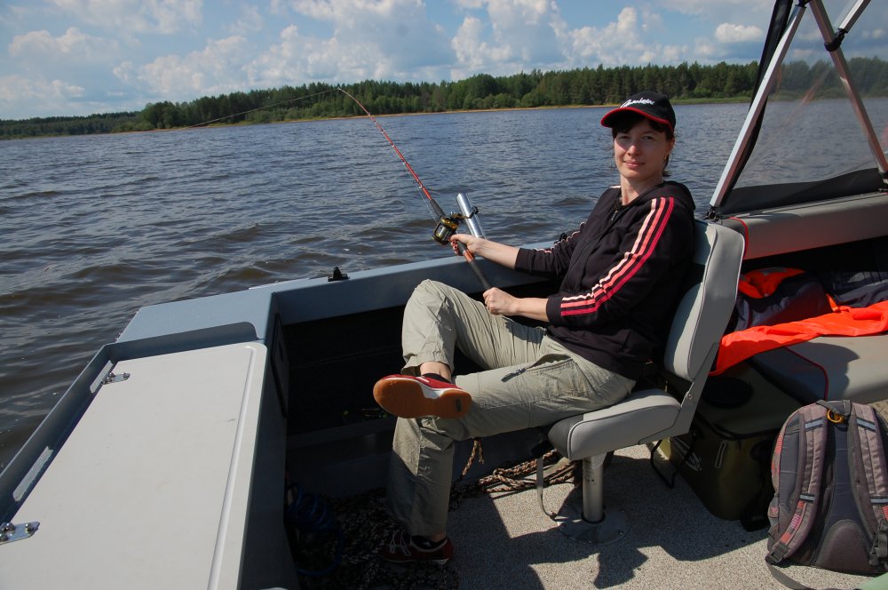 Потом поход пешком домой. После чего выход на воду. Марина осваивала тролинг, если можно так назвать. После джигования и после у неё обидного схода судочка, решила потролить - однако успешно, бершик 350 гр. Рыбалка завершена и на базу.