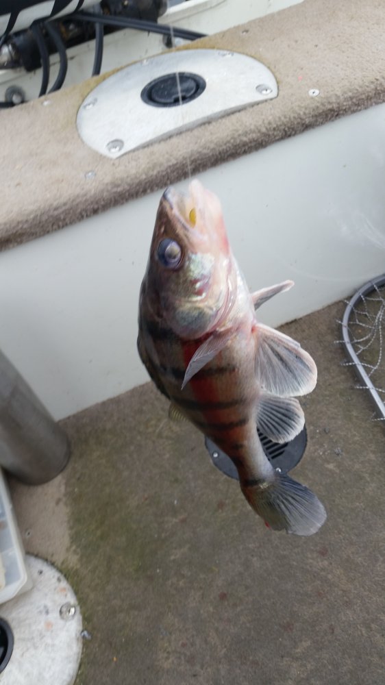 Ехал за окунем, окуня и поймал - целых 7 штук, у коллег аналогичные результаты, покрутился по зимним точкам, одного судачка слил у борта и тот за хвост прицепился, можно сказать - незачёт! Аборигены жалуются на прошедшие шторма, 2 дня Метеор не ходил из Рыбинска, видимо рыбу разболтало и она не ловится, хотя в эхолоте её видно...