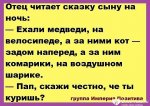 — Крышу Зенит-Арену разрушают бакланы. — Может ебланы, господин вице-губернатор? — Нет, ебланы строили, а разрушают бакланы. Жена мужу: - Ты почему во время секса назвал меня чужим именем? - Так темно же было. - А вы знаете, что отчество ребенку можно дать по имени матери. Например: Оксановна - Ага, это если не успела спросить, как отца зовут. - Чем чаще женщина кричит по ночам, тем реже выносит мозги днем. - То есть ее надо чаще пи@дить по ночам? - Не совсем так, но думаю, что этот способ тоже подходит. - Как избежать развода ? - Не жениться.