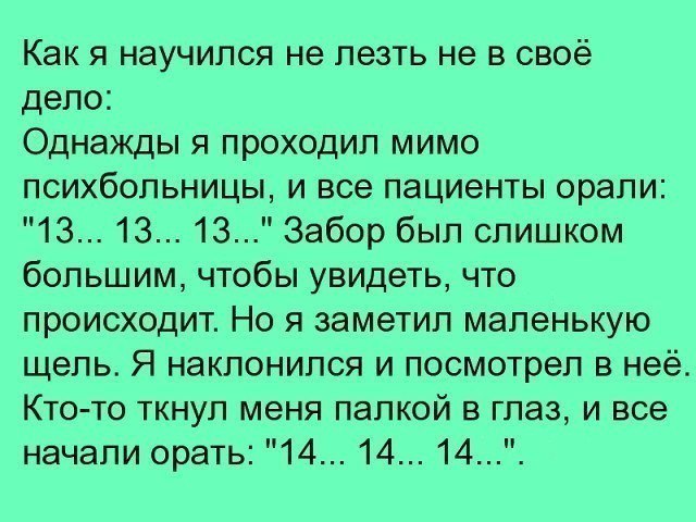 Эстонский тотализатор: соревнования борзых улиток. Вот где кипят страсти и выделяется адреналин! После нестчастного случая, в Монголии запрещено залезать в маршрутку с копьём. Икаю три часа уже. Сказали пить воду. Издеваются. Теперь я булькаю когда икаю. Вчера познакомился с испанцем по имени Хулио Надо... Так толком и не поговорили... В Институте Прикладной Физики АН России теоретически доказано, что литр водки, разлитый по полу, занимает площадь, равную одному квадратному метру и фактически представляет собой квадратный литр... Провести практические опыты у учёных пока рука не подымается. - Как грамотно написать письмо в тех.поддержку? - Уважаемые господа! Уже много лет являясь Вашим клиентом, и испытывая чувство глубокой благодарности за отличные программные продукты, я никак не могу понять, какого хуя... (далее описание проблемы...). Подходит шеф к уничтожителю бумаги и спрашивает у секретарши: – Маш, какую кнопку нажимать? – Да не надо ничего нажимать, бумажку вставьте... Шеф вставляет бумажку, и она исчезает в шредере: – Маш, мне три копии, надо...