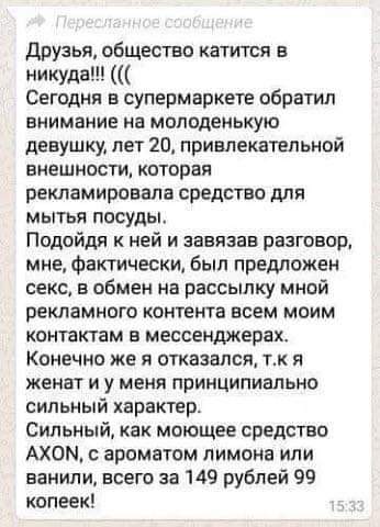 На сегодняшний день среди лиц пенсионного возраста распространён миф о том, что государство им что-то должно. Государство вас не просило стареть. -Ай,Моня я не могу позволить себе купить эти бруки по такой огромной цене,моя Софочка скажет мине:Я или эти бруки. -Знаете, Сёма, брюки таки гораздо важнее жены! Есть много мест, куда можно пойти без вашей Софочки, но совсем невозможно прийти без брюк! - Аааааааааааааааааааааааааааааааааааааааааааааааааааааа! - Успокойся и постарайся кратко объяснить, что случилось. - А. Что лучше, взять беспроцентный кредит или положить на выгодный депозит? Лучше взять и положить на обоих. Приманки придумали не для того, чтобы кормить, а для того, чтобы ловить. Абитуриент Иванов на вопрос брата–десантника -Куда поступать будешь? Ответил: -Тебе какая разница, дебил. И поступил в институт Склифосовского.