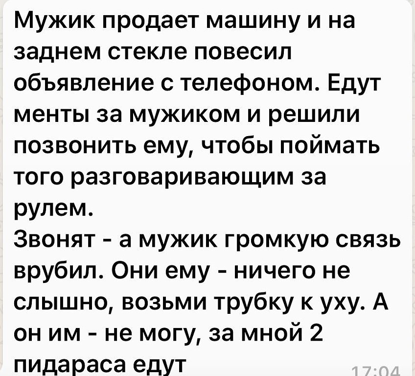 — А кто такие, собственно говоря плохие девчонки? — Это те, с которыми хорошо. "Боже мой! Как тесен мир, как тесен! " — радовался врач, назначая гаишнику по шесть клизм в день . Передача "Спокойной ночи малыши" знаете? Так вот прикиньте, какая выдержка должна быть, чтобы вертеть куклой Хрюши, сидя под столом между ног у МИСС МИРА Оксаны Федоровой и при этом умудряться слова не забывать! Парочка влюбленных: — Милый, так хочется чего-то чистого, светлого… — Пиво будешь? Три раза уже покупал бухло на новый год. Пойло заканчивается, а год сука нет.