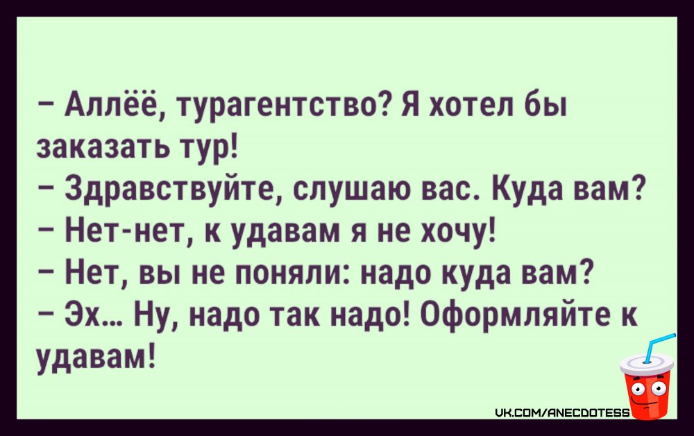 Поликлинике требуется опытный проктолог, чтобы достать неопытного... Протрезвел до неузнаваемости. - А вы как считаете? - А я никак не считаю. Я гуманитарий. - Скоро Пасха. Ты яйца покрасил? - Я атеист. Я их только почесал. Африканские ученые в шоке: они есть. Мой рекорд на стометровке - 50 метров. Единственное, что осталось от дайвера - это ласты и селфи с акулой. Пока душа от счастья пела,- пыхтело тело и сопело... Пионеров строем водят в мавзолей учат как не надо хоронить людей. Обычные люди вырывают с мясом. Веганы - с корнем. Жили-были Удачник и Неудачник. Один стремился, другой стремался. У вратаря футбольного клуба даже на телефоне много пропущенных. Неопытные грибники часто ужинают, но редко завтракают.