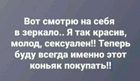 Бывает так,что треснешь водки и жизнь улучшится на миг.Бывает так,что треснешь водки и фиг. В доказательство того,что морковь улучшает зрение,можно привести тот факт,что кролики не носят очки. Вот тебе и очередное послание президента,ни слова о поддержке семей с котами. В русских порнороликах во время секса с медсестрой в кабинет время от времени заглядывает бабушка,что бы ,только спросить. Всё возишь и возишь эти проклятые саночки,забывая,что надо кататься,хотя бы изредка. Стою себе на улице,курю.Подходит тётка и такая говорит,мол,не кури,а то в 35,будешь выглядеть на 45... Более охренительного комплимента в мои 57,мне ни кто не делал!