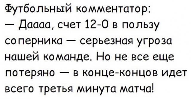 Во время восстания машин,главное оказаться на максимальном отдалении от фабрики вибраторов. В Питере у таксиста угнали такси с пассажиром,пока тот дрался с пешеходом. Как только экстрасенс говорит,что может предвидеть будущее,сразу пропишите ему в рыло,не беспокойтесь,экстрасенс это предвидел и увернётся,а если не увернётся,то чего шарлатанов жалеть. Обьявление: Интеллигентская семья продаст двух фортепьянов и одну роялю,мешаюца в колидоре.