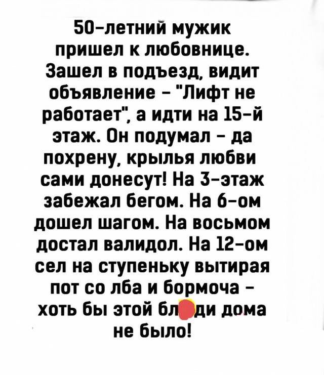 Пятидесятилетний мужик идёт на потрахушки к молодой любовнице. Заходит в подъезд - лифт не работает, а ему на 12-й этаж.