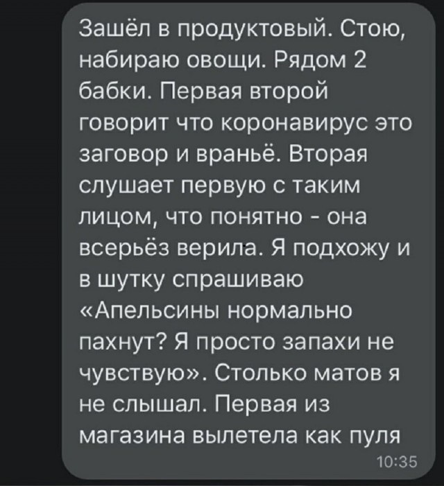 Отголоски сотовой связи...Стою у подъезда, на домофоне набрал номер квартиры (еще раз: домофоне). Пошёл вызов. Жду. - Аллё. Кто там? - Батя, это я, Игорь. - О-о! Игорёха, привет! Ты где сейчас?.. ---//---- Подходя к одному известному вещевому рынку, наблюдал такую картину: К выходу летящей походкой направлялась миловидная стройная брюнетка, взвалив на плечо квадратную картонную упаковку двухметровой(!! длины с неизвестным содержимым (вероятно гардина). Зрелище напоминало пародию на железного дровосека Арни из Коммандос, и, курящие в сторонке продавцы, не удержались от ехидного комментария:"Девушка, это у вас мачта или шест?"Ответ девушки, по силе воздействия, превзошел бы самого Шварценегера: "Фалоимитатор, импотенты!" ---//---- У приятелей был попугай породы "ара", он такой большой, красивый с огромным клювом. И вот так случилось, что надо было уехать и птицу пристроили к одному товарищу на время, а у того был кот, считающий себя главным если не в мире, то в квартире точно. Попугая принесли в клетке,поставили на стол и кот тут же занял весьма враждебную позицию, начал бросаться на клетку, всячески угрожать и т. д.Но так как попугай - не канарейка, да и клюв у него серьезный, нынешний хозяин решил клетку открыть и поглядеть чего будет. Клетку открыли,попугай вышел и направился к коту, кот сперва шерсть дыбом, в бой.Но потом как-то сник и начал потихоньку пятиться задом, а попугай знай себе идет на него, кот уперся спиной в стенку, попугай подошел к нему в плотную и спросил (он, оказывается, был говорящим): "Чаю хочешь?" Кот три дня сидел под диваном. ---//---- Работаю в пожарке . Поступает нам вызов - типа хата горит по такому то адресу.. выезжаем, выбиваем окна, двери и тушим. Реально, мало что спасти удалось, обои и те если не сгорели, то закоптились все, что там про мебель говорить... Вроде усе побороли, валим на выход.. проходим мимо ванны, судя по звукам там есть кто-то. Взламываем дверь.. !!! Там чел в ванной плещется, обкуренный в дым... утят резиновых купает, болтает с ними.. Мы в шоке, он тоже. Завернулся в полотенце выходит, осматривает сгоревшие, закопченные стены и возмущенно так выдает: "Ё.... Нафига вы мне тут так натоптали!"