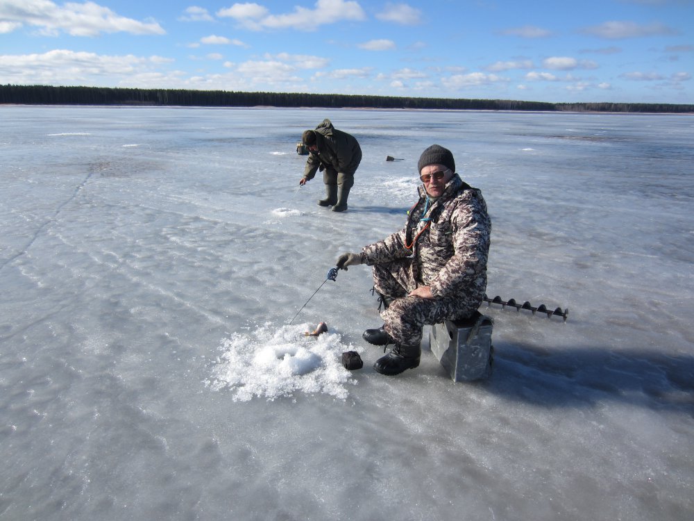 В первой же береговой трещине чуть не искупал своих товарищей – слишком резво проехал. Дальше нормально – трещины за островами провешены и вполне проезжабельны. Снег на льду отсутствует и появляется только за 5 км до границы заповедника. На поляне встречаем уважаемых завсегдатаев – Студента и Кудесника. Делимся информацией. Народ в поиске, с утра был слабый выход. Готовим инвентарь