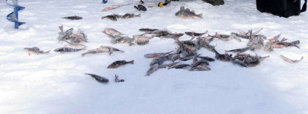 Клев был интенсивный. Я рыбачил на среднюю мормышку и гулял между 4-мя лунками. Зять блеснил, сверлил дополнительные лунки, искал рыбу.