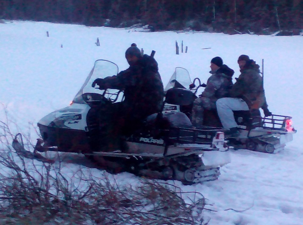 На охоту на уток выехали 6 мая в 18 часов. Поехали на мощном снегоходе, к которому прицепили комфортабельные сани на четырех человек.