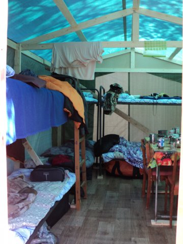 Состав лагеря: четыре жилых палатки, столовая, кухня, баня, туалет.