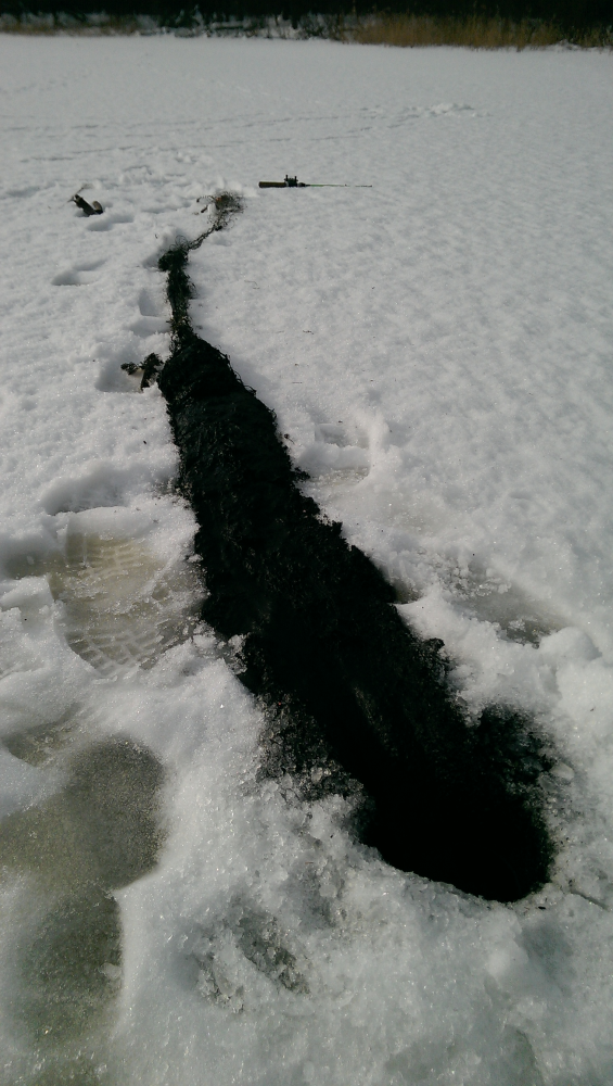 В очередной лунке цепляю сеть старую. При попытке отцепить отцепом рвется металлический поводок (хреновенький видать). Начинаю огорчаться - жалко дорогую приманку. Но вспоминаю про блесну, валяющуюся без дела в ящике который сезон. Цепляю ей сетку. подтягиваю к лунке, багрю и благополучно извлекаю монстра на лед: