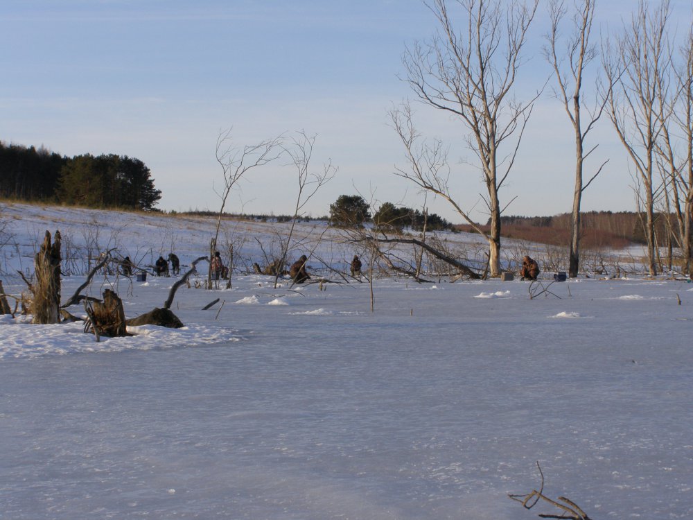 А там народу уже человек 50-ть, рассыпанных по всей “лесополосе”! В отличие от феномена зайца, сидящего в траве, покрытой капельками росы, у них было всё по рабочему: то там, то здесь проскакивал карась от 300 и выше, что доставляло удовольствие только словившему оного, остальные же в этом случае, хватались за буры и начинали сверлить полуметровый лёд, в надежде наткнуться под каким-нибудь деревом на тот самый одинокий лапоть, которого пробудила буравАя весна. В итоге, пока осматривались и приспосабливались к условиям боя, наступил полдень! За это время, у одного из нас – обрыв 0,14, у второго ни поклевки. Я ж из 2-х поклевок, одну реализовал – верных 400 гр. :good:Но такая ловля, когда 1 поклевка за 4 часа, нам наскучила.:( Народ начал расходится, унося домой одного, а в лучшем случае 2-х карасей. Двинули и мы, по дороге решив, что заскочим на проходной карьер. Посмотрим, что там?