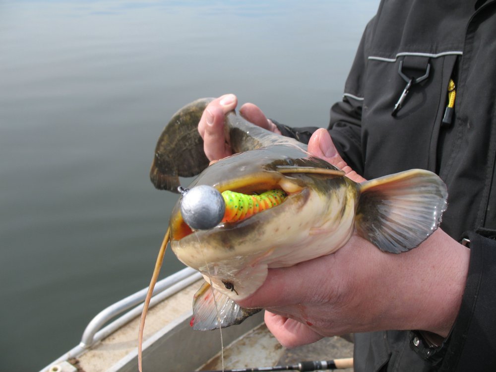 Ну а я открылся ! Напротив дома :) . На каждом забросе вынимаешь пучек гнилой травы . Или еще что нибудь интересное :D . На очередном забросе зацеп . Вроде идет , идет тяжело . Качаю и думаю - дернулся чтоль кто нибудь на том конце . И хоп ! Тугой такой потяг ! В голове сразу нарисовался образ судака , на трешку минимум <:-( . Но это был он ! За хвост :) . В дальнейшем еще контакты были , а вот судака не поймал . Реально трава задолбала . В другом месте пробовал , травы не было . Рыбы тоже :) .