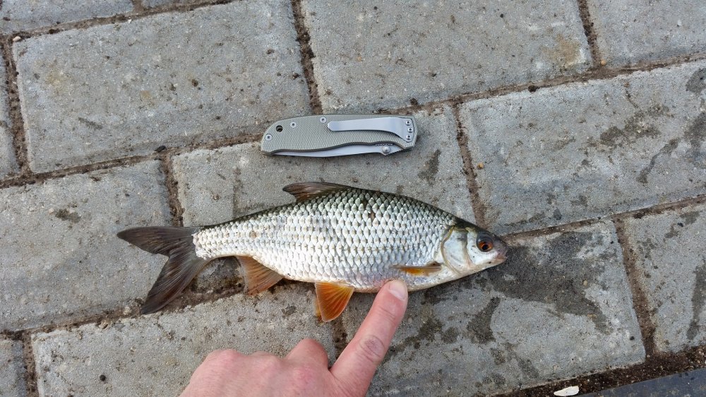 Прошелся дальше вдоль набережной, там пару раз забросил....ветер еще больше. Вернулся на первое место, там и закормился -слегонца :) 3 поклевки всего было. 2 морских плотвы(фото) . На 0,14 леске поднимаешь-уже на пределе :) И по концовке лещик на кило(пофиг ему что вертолеты летают и стройка рядом). Носился , даже фикцион пришлось отпустить. Потом устал, но поднять все равно без вариантов. Оторвал. Зато народу собрал . Нашлись добрые люди, помогли снять на телефон. Ща загружу.