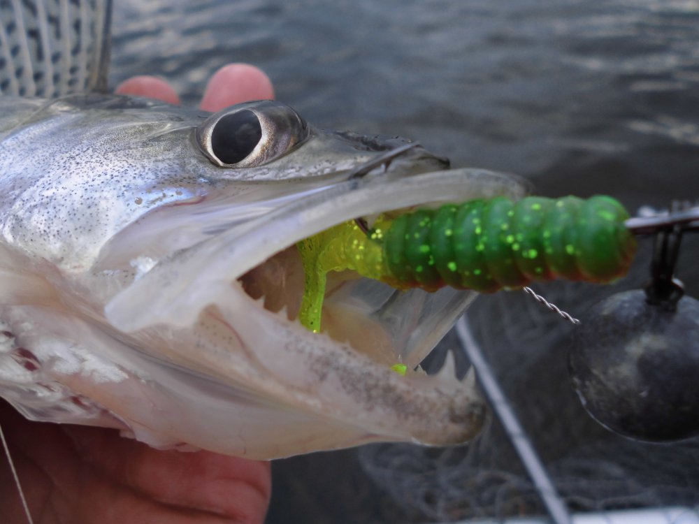 Находим локальную ямку по эхолоту с присутствующей белью и я сразу получаю поклевку,но не реализую её,лишь следы от клыков говорят о присутствии тут не крупного судачка,но дальнейший облов ямки с анимациями и сменой приманок результата не принёс.Идем дальше,находим бугорок с ракушечником.Серега с двух первых проводок снимает от туда две рыбы-щуку на 1.5 кг и окуня грамм на 400.Сработал манс грязно-краснокоричневого цвета с блестками,ставлю такой же и пять пустых поклевок подряд...приманка явно крупновата для окуня,беру ножницы и после некоторых манипуляций получаю нужный размер и сразу ловлю полосатого под полкило:)Настроение немного улучшается,но пролетевшая над нашим бугорком моторка всё ставит на свои места,поклёвок больше нет...Сука,жаль гидроцикл с собой не взял,а то бы дал я этому деятелю порыбачить:)