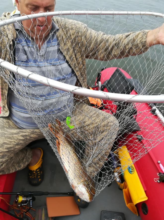 Отец ходил по берегу с блесной. Так вот одна поклевка.