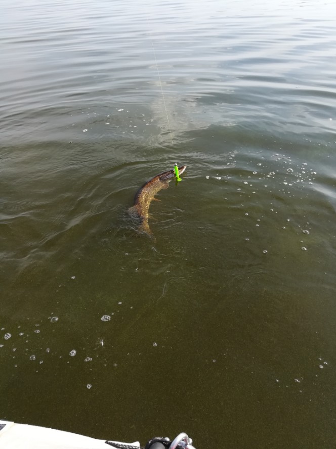 Ближе к вечеру, эхолот рисует выход из ямы и стаю бели почти во всю толщу воды. Надо проверить. Якорюсь. И буквально на первом забросе мелкий щуренок. Прям с верху бровки. На второй или третьем уже пониже щучка чуть покрупнее. Может около кило. Но все равно не та эта рыба. Еще немного кидаю, но больше никого нет. Все иду домой.