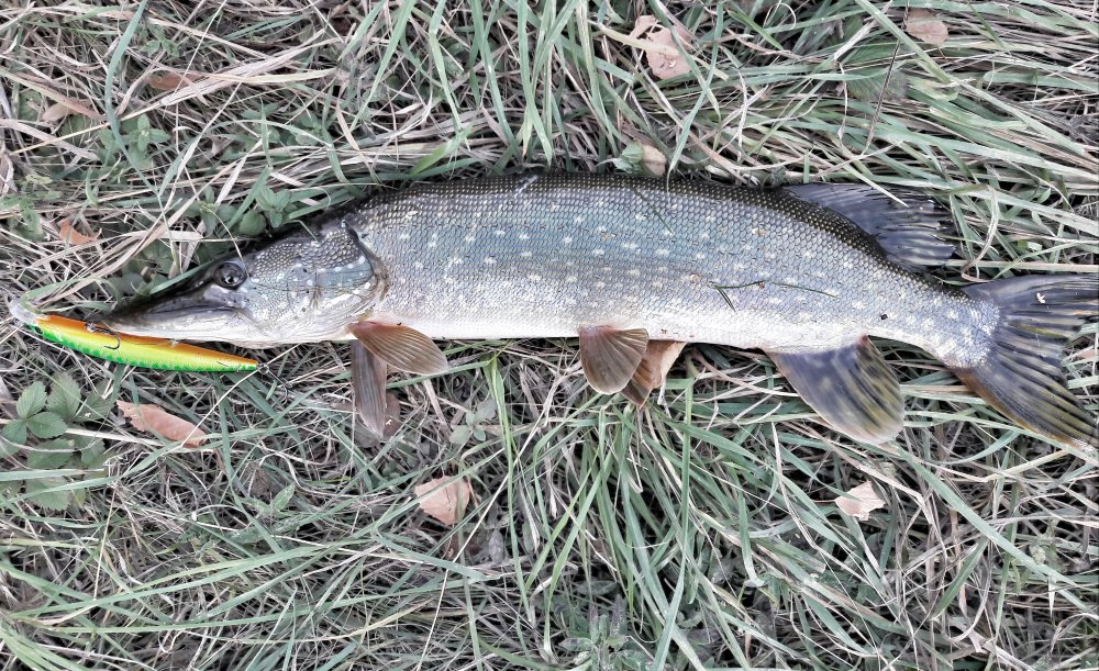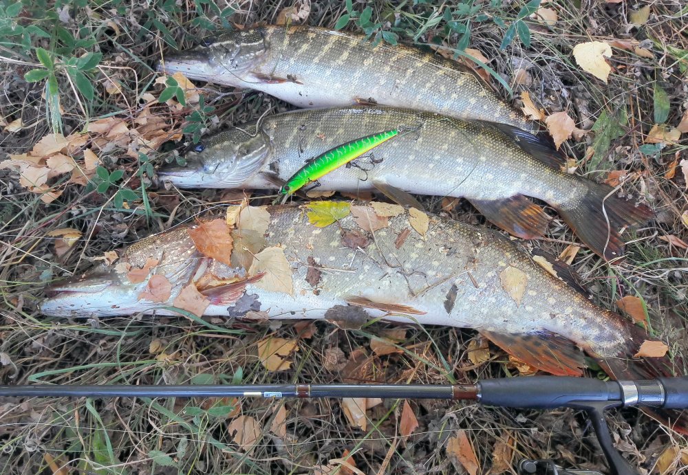 Вода остывает уже даже на ощупь прохладная. Ну и щука видимо в календарь смотрит. Короче и вчера и сегодня ей нужно было большой кусок на медленной проводке с паузами. Все поклевки на паузах. А поклевок было много. На фотке это часть. Две еще отдали. Одну отпустил. Одна сошла. И были еще выходы промахи, подбои.