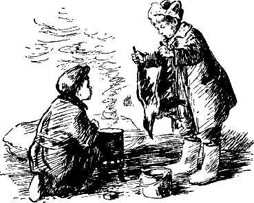 "...Мазин скучал. В землянке под старой елью было темно и тихо. У входа, завешенного белой простыней, валялась убитая из рогатки ворона. Иногда Мазин отодвигал край простыни, зорко и настороженно оглядывал берег. Он ждал Русакова..."(С)