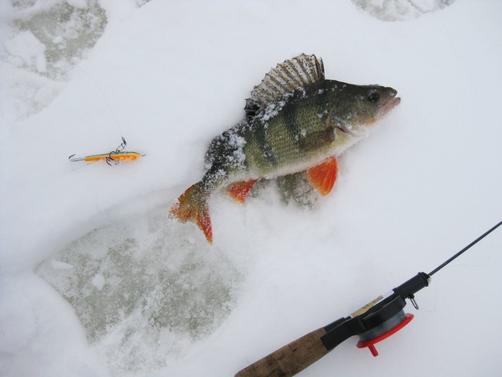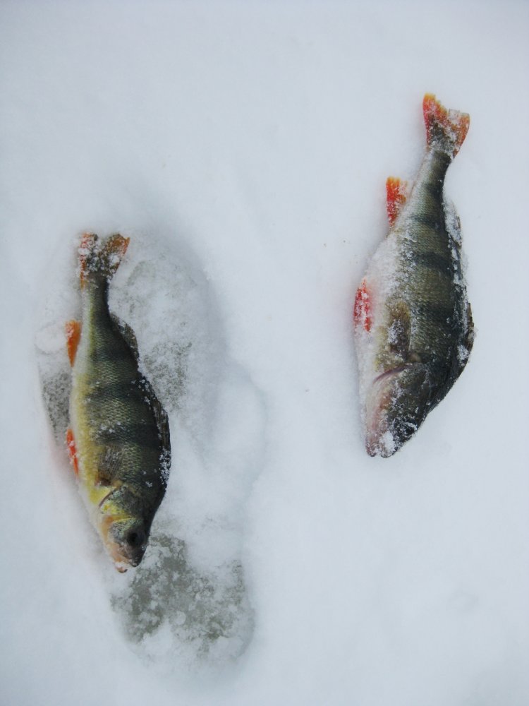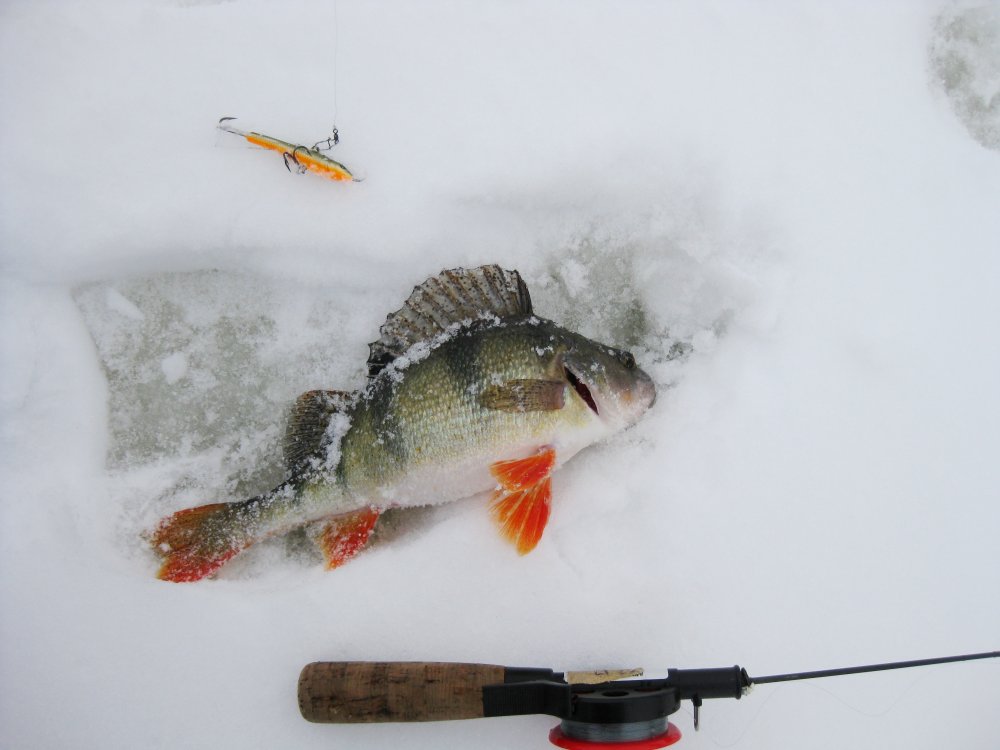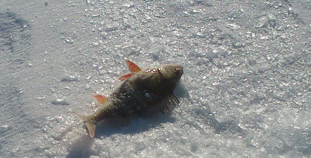 На четвертой лунке у меня будто поклевки пошли, и у напарника тоже кто-то балансир подбрасывает, но не засекается. Толи мелочь, толи аккуратно берет, не пойму. Но вот и нормально кто-то клюнул, даже тонкий хлыстик согнул, а как не подсёкся, я не понял. Грусть. :cry:Ничего, главное поклевки есть, сейчас доловим. И есть, вот он! Да, хороший какой, грамм 400! Темно-золотой окунь красавец! Соскучился я по нему, по хорошему окуню. В этой лунке больше нет поклевок, ищу. В голове, может расцветка рапаловской 7-ки не та. Меняю на другой цвет, потом на третий – пусто, нет поклевок. Напарник смотрю, кидает фразу, а не поехать ли нам в какое другое место окуня поискать? У него так ничего и не попалось. Отвечаю, что дай 5 минут, понимая, что окунь тут есть, нужно искать. Была не была, ставлю 5-ку (не люблю я эту мелочь) и это оправдало себя - есть удар! В заглот, пол балансира хотел откусить двухсот граммовый окунёк. “Ну, значит остаемся, раз он есть”, и я начинаю переживать за коллегу, чтобы он тоже поймал и уверовал в этот пятачок льда. Из-за течения мои мытарства с мелким балансиром растянулись еще минут на десять. Опять ставлю серенький цвет и нахожу лунку, где окунь сначала показал себя, притронувшись к 7-ке. Дальше дело техники, нужно его только здесь дожать…, доиграть. Вот и есть еще грамм 150-ть. Интересно, а что, дальше будут мельче или …? Ха, вот и 3:1! Наконец-то! И у соседа проклюнулся. И тоже хороший где-то грамм на 300-та, рад за него! Раскручиваем, рассверливаем этот пятак, но клев, похоже, начал спадать на нет. Толи снег пошел, толи время. Приехали-то мы сюда ближе к девяти утра, хорошо, что еще этих застали. В результате, в полпервого решил(и) сворачиваться. Счет 4:3 в мою пользу. Весь окунь зачетный!
