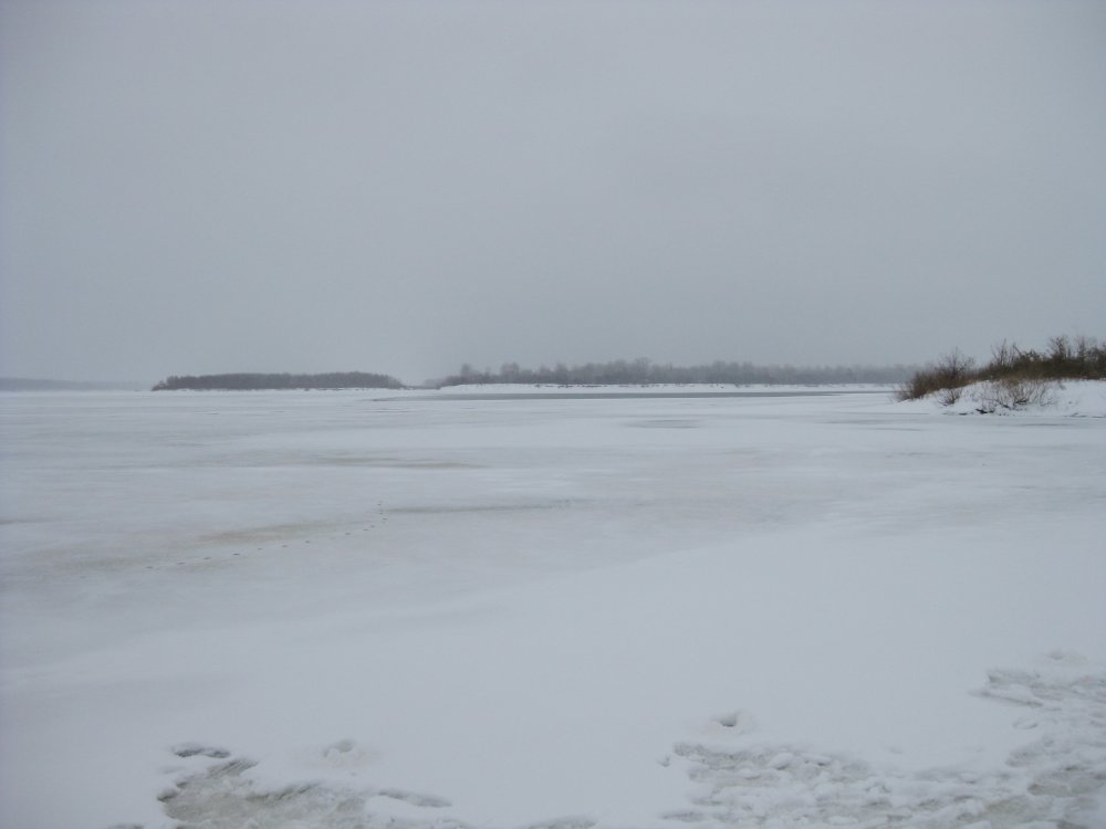 А между тем прошел уже и час, и другой. Иди особо не куда. Начал смещаться из протоки ближе к заливчику на мель, где летом трава, т.е. по сути, продолжал ловить на глубине метр, полтора. На более глубокие места не пускали промоины. И только ближе к десяти утра с этого пяточка я все-таки зацепил одного нормального окушка грамм на двести. Потом через час еще одного такого же. И всё. Друг же мой поклёвок так и не увидел. Утренний клёв прошел, так и не начавшись. Ветер со снегом усиливался. Решили, что приключений на этот день достаточно, пойдем назад. По дороге остановились на полпути, решили наобум поискать счастья. В заливчике нашли лёд по барашек ледобура. Отдохнув, таким образом, над пятью-шестью лунками, зашагали вновь к машине.