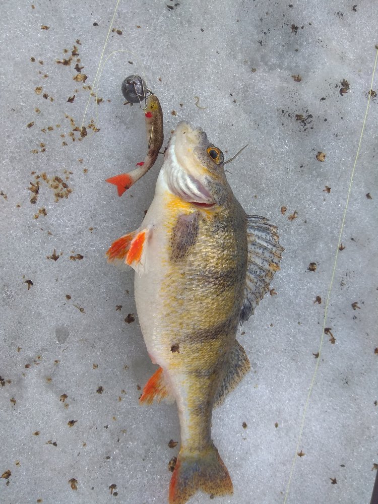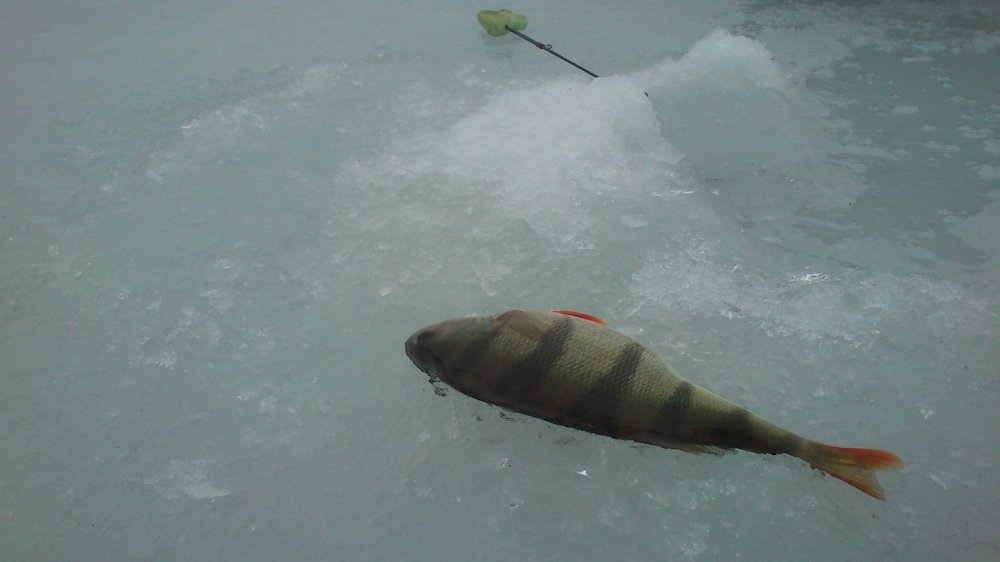Поклевки с первой проводки, но три подряд сходят с ведьмы на пол дороги, цепляю на два из трех крючков опарыша и ... первый на льду, как один местный класифицирует размер - "пивняк", подряд три таких - фото на память -