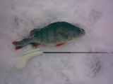 Вчера на нашем озере.Клев никакой,поклевки были в основном когда переставал идти снежок.Как всегда окушок,плотва почему-то перестала ловиться со льда вообще.Сначала ловил на паровоз,потом перешел на гвоздешарик,поимел обрыв и сход чего-то хорошего под лункой после перевязки мормышки.Два ротана,но мельче чем обычно, окуней три с половиной десятка.