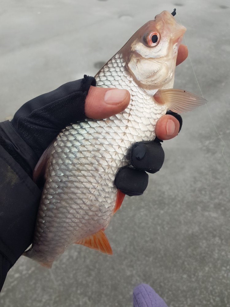 Целый день просидел на двух лунках, после 14 часов нацепил одного опарика, это добавило в ассортимент густеру и подлещика, на ловлю плотвы не повлияло.
