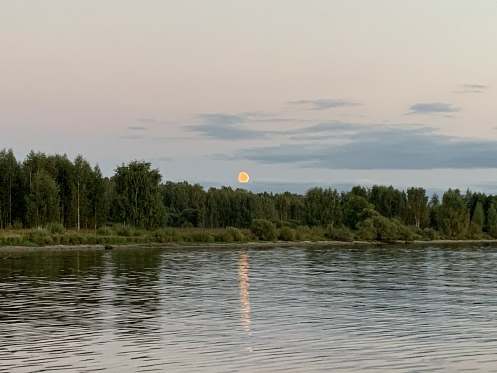 В субботу ночью рванули на Рыбинку. Выйдя на улицу ещё вечером, увидел полную луну Но как говориться, уже решили, машина загружена. По дороге через Калязин - на 4-ку. Большинство отремонтировано, м/у Калязиным и Угличем по Ярославской обл. местами залатана, по Тверской после МО, идут ремонты. На снятом асфальте, как то неприятно влетел я ямку. Ничего страшного, но ощутимо неприятно. Да, после Углича поаккуратнее. Как уже писал раньше, практически во всех населенных пунктах камеры, ну и живности много. Много сбитых енотов, лис, задавленных ежей, ну и лоси присутствуют. Проезжая Архангельское, подумалось, но нет, обошлось, пронесло..... А нет, енот перебежал дорогу А далее, и лосик, нет, два, нет, три слева в кювете. И деревня слева дальше видна. Что они делают на краю деревни? Совсем страх потеряли. Посигналил, они развернулись и убежали не спешно. На Себлу приехали с рассветом. Места все заняты. Катались по берегу туда-сюда, выбирая местечко, где приткнуться. Нашли одно место, загнал машину м/у соснами, место не плохое, но «нашей» поляны со столиком нет Разгружаюсь. Лёля решила сходить в лесочек. Зовет. Иди смотри, что нашла. И прямо рядом с машиной, на тропинке в лесочке, два хороших боровика, потом на берегу ещё белого приметила. Сразу мысль — ну мы сегодня грибов то….. Но забегая вперед скажу, набрали, но не так, как думалось. Грибы уже «взрослые» в основном. Накачал лодку, повесил мотор и приблуды, рванули в море, за 17 километров. Пришли на точку, лодки уже хороводят Достал коробки с воблерами, увидел в одной коробке давно купленный и забытый воблер Герман 5-8+, поставил его жене и…. Короче на него она и поймала всю рыбу три судачка 0,8-1,1кг. И щучку на 3,3кг. Я переменял все воблеры, что ранее всегда работали, потычки не видел. После обеда, стало сильно жарко, солнце печет нещадно, пошли к берегу. Приплыли, а народу на берегу практически и нет, все поуехали. Переехали на «нашу» полянку со столиком. Сходили в лес, но собрали не много, видимо прошлись до нас, хотя свои литра полтора грибов сварили. Пока Оля варила грибы, я решил сплавать половить окуня. Собрал спиннинг на окуня, повесил тейл и влево от Сыпучки. Только отъехал, на воде тюлька «бурлит». Понимаю, что окунь не клюнет, но как такое пройти? Покидал немного, только по спинам «походил» Далее помчал в сторону Логов. Там поменяв несколько мест, тейл, джиг-риг, ни тычка. Плюнул и домой. Разжарили кашу, налили и посидели под костерок. Так как уставшие были сильно, хоть в этот раз и поспали часика полтора перед дорогой, пошли спать. Утром, еле уговорил себя встать на рыбалку. Такая лень, но собравшись духом, вылез из спальника, оделся и разбудил Лёлю. Вышли на воду в 7 утра и проплавали до 11-30. Как итог, один окунь уже в самом конце, когда хотели спиннинги уже выматывать. Пока тащил его, он перед лодкой спугнул стайку тюли. Кинул воблер в заброс и уже у лодки, воблер практически вверх шел, поклевка окуня, но перед поверхностью сошел. Покидали немного, но не судьба. Как то совсем в воскресенье не алё. Видимо народ что то знал, раз после обеда в субботу срулил домой Придя на берег, стали собираться. Оля почистила рыбу аккумуляторной рыбочисткой (очень жене понравилась машинка — удобно и быстро), чтобы дома не мусорить, я помыл лодку, собрал вещи, поели перед дорогой и домой. Правда зарулили в лес, немного нашли грибов — 2 белых, подбе