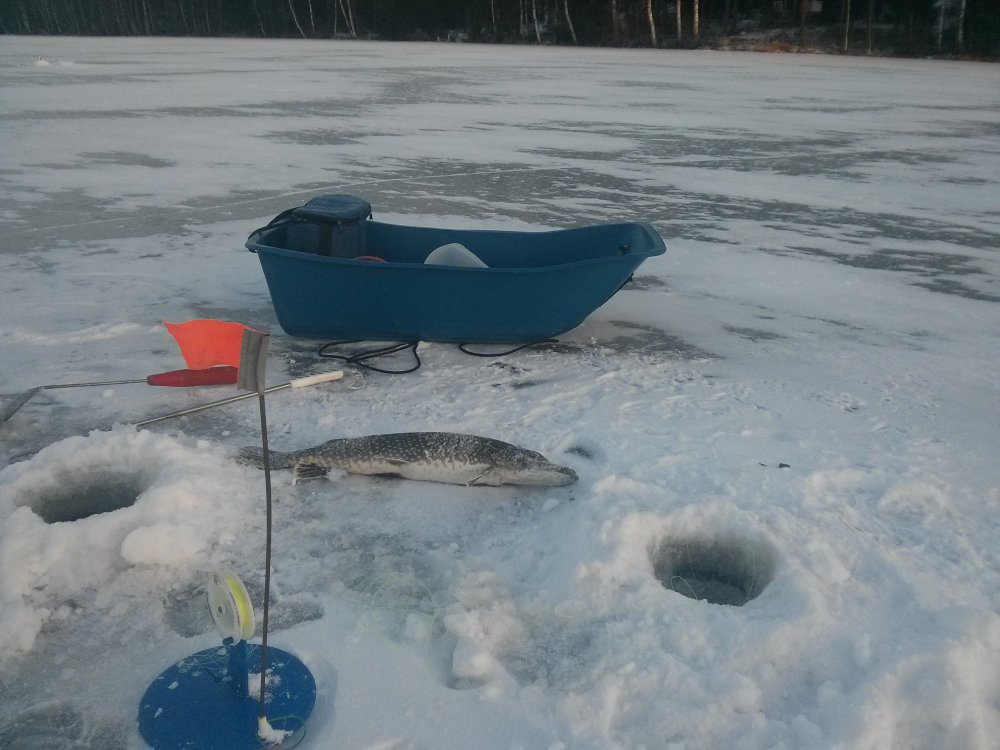 Через 15 минут еще флаг и еще килошка ....носился по водоему бурил искал живца ....но хрен там ни блесна ни черт не дали результата . следущий флаг и пока дошел петля вокруг стойки и упорная щука все равно размотала почти всю леску , но в итоге бросила ... живец кончился ...:bax:... попробовал ратлином поискать но стало темнеть и я помчал домой пить водка и развлекацо в тепле :russian:
