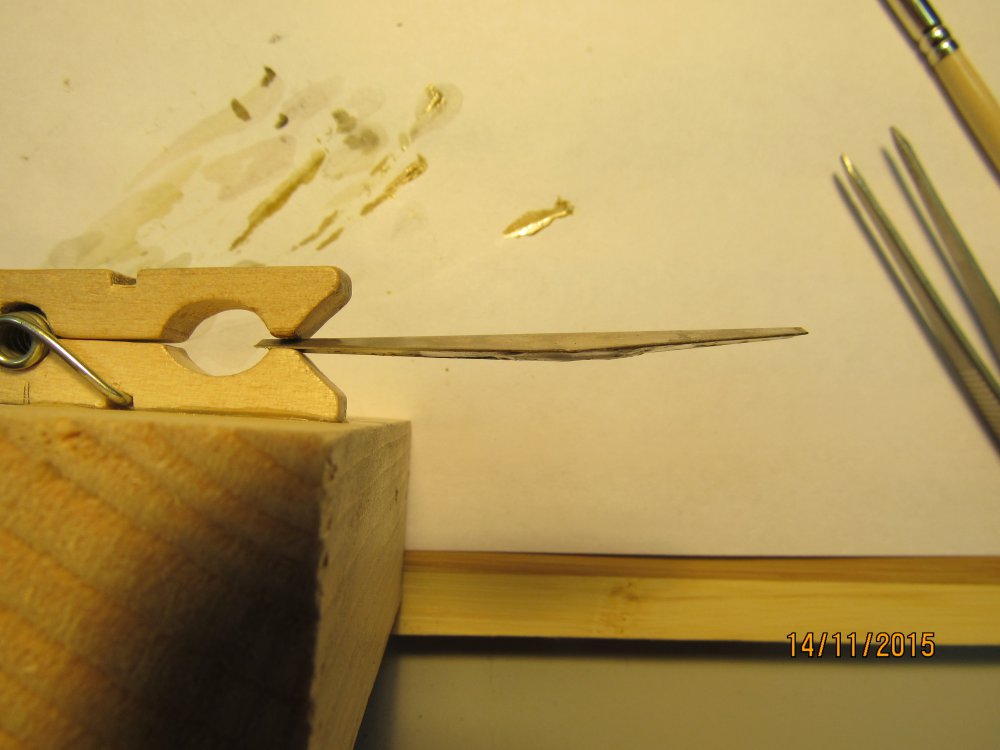 Так, все за мной успевають ? Тогда продолжим.... Технология изготовления блесны Ромб. Часть 4. Теперь обтачиваем коронки, т.е. убираем лишний припой. Я делаю это сначала на деревянном бруске, обклееном крупной наждачкой, потом на напильнике. Чтобы коронка не скользила в пальцах, приклеиваю сверху кусочек двухстороннего скотча. Должно получиться что-то подобное: Мощным паяльником, путем быстрого локального нагрева делаем освобождения в коронках для петельки и крюка: Ну вот, все готово для сборки блесны: Продолжение следует...
