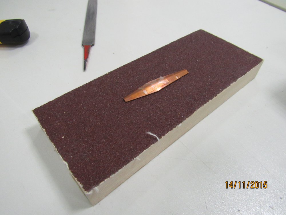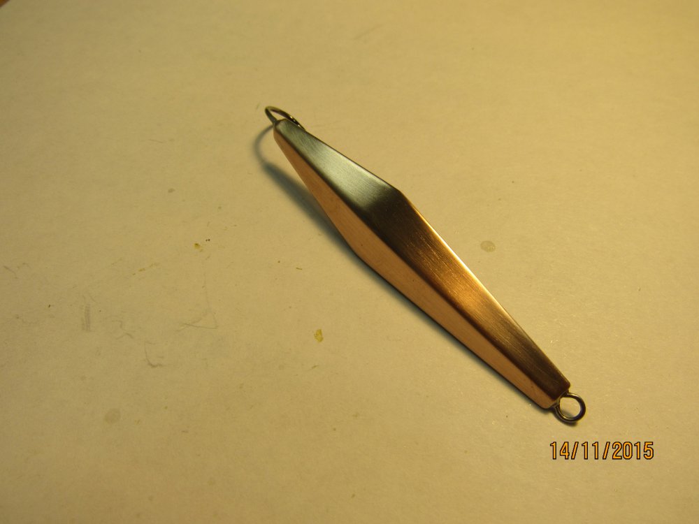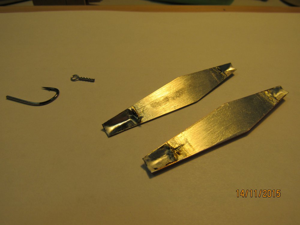 Технология изготовления блесны Ромб. Часть 3. Готовые коронки зачищаем изнутри наждачной бумагой и залуживаем: Потом ПРЕДВАРИТЕЛЬНО заполняем коронки припоем, таким образом, чтобы в месте будущего перегиба был некий избыток, это важно: На каком-нибудь остром ребре, например на сапожном ноже, зажатом в тиски перегибаем коронку до тех пор, пока кромки ребер блесны не окажутся в одной плоскости. Торопится не надо, лучше все сделать аккуратно и правильно! В результате было: стало: После этого, ставим заготовку в подставочку и окончательно заполняем припоем. Чем ровнее и без излишков заполним, тем меньше потом придется обрабатывать: Продолжение следует....