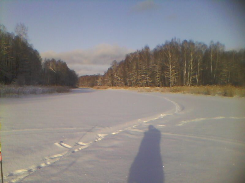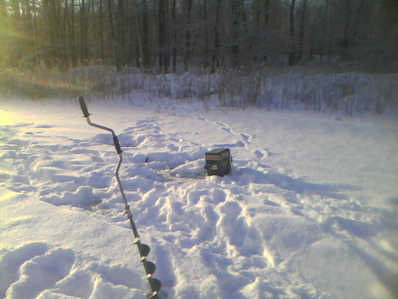 Вчера после приезда с рыбалки, когда супруга спросила как я, я отвечал как тот мужик на льду , с пузом, наамально! А сегодня встал, вроде ничего. Поехали к друзьям в Ступино (МО). Завез супругу, а сам на Оку, куды ж без рыбалки А оказалось на реку то не зайти. Поднялась вода,притопила берега и куды не ткнешь пешней, лед проваливается. С пятого раза нашел место где вроде бы зайти можно. Наложил несколько веток на лед, так просто нереально, лед пробивается с одного удара и пешня уходит на полтора метра. Вообще потихоньку зашел. Просверлил лунки, лед 40 см , не менее. Кажись подсадил где-то ножи моровские, при сверлении бур ходит элипсом, но сверлит. Вообще перепровал балансиры, блесны, глухо. Там где санки на фото глубина 4 метра, где ледобоур-8 метров. На мормышку вытащил ерша, сразу поставил жерлицу, простояла до темноты--безрезультатно. Смотался и уехал. Под вечер пришли два мужика, поставили жерлиц, на берегу установили палатку куб, собирались переночевать. За бортом -21