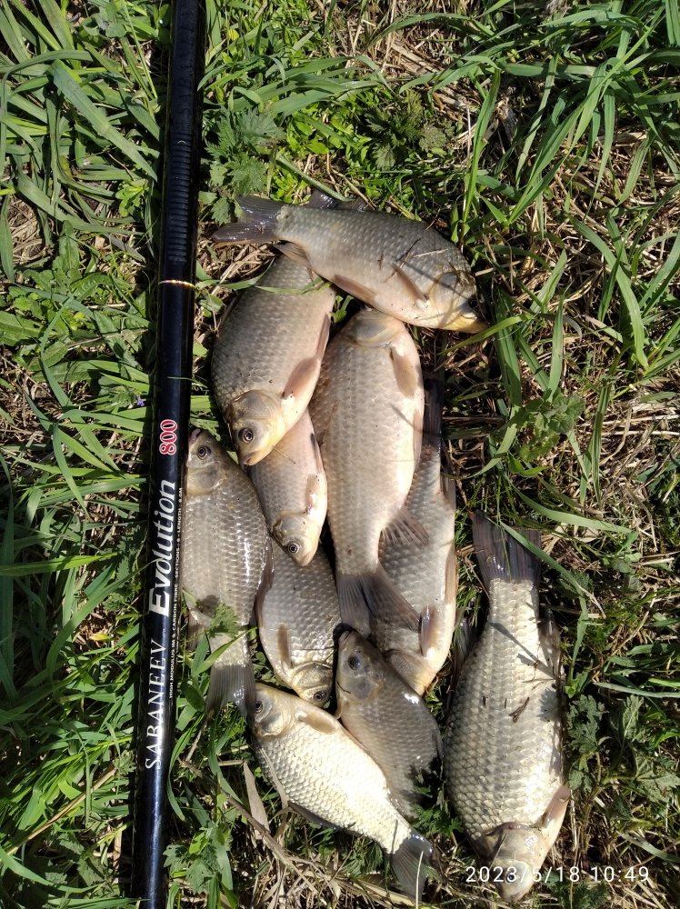 Карась нерестился и пока не закончился свадебный переполох, поклевок практически не было. Расклевался только часам к семи. Напарник ловил на две болонки и "фидер"(донку). Я ловил на маховую 8-ку, на самодельное тесто. Карась ловился, но много мелкого. У напарника не поклёвки.