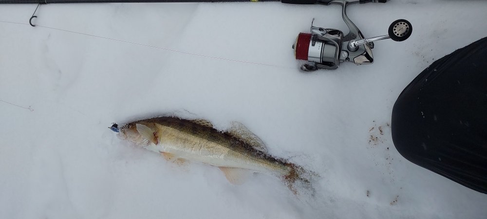 Гамарджоба! Сегодня. Где-то под Бронницами. Джиг. С Колей и Доктором открыли сезон зимнего спиннинга. Пришли на берег затемно. Не рассчитали временную поправку на новую дорогу в объезд Октябрьского и Островцов. Теперь получается быстрее. Никаких светофоров и толчеи. Первым отличился Коля. Берш. Потом доктор. Багранулся лещик. Я довольно долго ходил "цел..." пардон девственником. Ровно до того момента, когда решил облегчиться с двадцатки до четырнадцати. Начались поклёвки и попались судачёк и жабка. Ближе к трём спустил какую то приличную рыбу. Настолько приличную ,что временами было тревожно за новую палку. Так амплитудно "это" трясло головой... Ну да ладно, ещё надеюсь, клюнет. Ближе к вечеру багранулась хорошая плотвица. Но это не считается. Рыба не профильная. Снега на юге ровно в два раза меньше, чем в Медведково. Удивительно. Ребята съездили за бургерами и попутно зашли в Пятёрочку. Там стоял снеговик. Креативненько! В общем накидались, находились от души. Конечно не 17 километров, но где-то рядом. Вот...