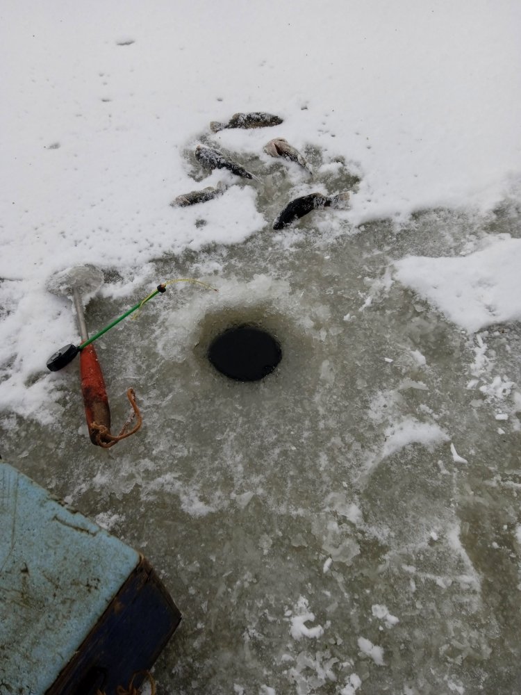 Ротан поклевывает маленько. Лёд двойной , нижний черный ,5-7см и сверху снеговой 2-см. Местами пробивается с двух ударов , это там где снег. ,,Ловлю второй день , не особо , т.к. ходить ещё стрёмно.