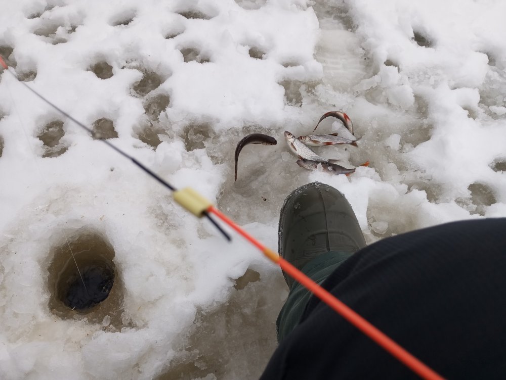 Утренняя попытка до 9-ти утра поймать уже крупного судака, не принесла успеха. Нужно было возвращаться к ловле подлещика, но нужно что-то менять. Конечно, была надежда на второй день кормления одних и тех же лунок, на погоду, которая уже, в принципе, стабилизировалась в своём минусе, но самим предпринимать что-то тоже надо. Решено было сделать по лунке, прям, на русле. Снасти у меня позволяли ловить при не сильной тяге, в арсенале были удочки с тяжелой мормышкой. более 2гр. и там же поводок с крючком. Сказано, сделано, но до обеда картина с первым днем не сильно отличалась. Разве что окунь появлялся на лунках чаще, а подлещик (у меня) был чуть крупней, чем в первый день, поэтому к двум часам в ящике уже было 2,6кг. мелкого подлещика, густерки и окуньков, не считая отпущенных, прям, совсем недомерок.