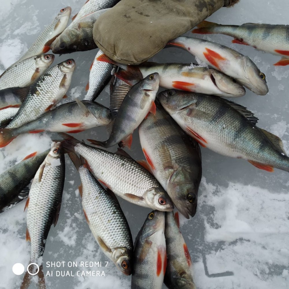 вкладыши от етти прекрасненько подошли к ним. В семь уже на стоянке у шлагбаума, стоянка полупустая даже место рядом со спуском свободно. Это и решило что останусь здесь а то думал податся на Дубна гаражи. Бураньщик Олег только что отвез партию на морковку, я оказался один и потому не стал его напрягать. Стало чуть посветлее и я почапал тоже на морковку. Морозец градусов десять и главное сильный ветер правда почти попутный. Корыто со снарягой катится почти сам по голому льду а вот идти даже в шипованных роксах всё равно напряг, без них наверное раз пять бы навернулся. На месте стоит штук девять палаток, скажем так кучненько, не стал беспокоить народ, отступил метров на пяьдесят вниз по течению. Пробивая дно всего около восьми метров в нескольких точках, странно получается народ сидит на поливе а не на русле как я полагал. Уже подумал не проскочил ли я русло, но морозец и сильнейший ветер расставили - бурись там где видел рыбу. Ну и забурился тоже на восьми метрах. при сильнейшем ветре уёкался ставить палатку да ещё и голом льду. Поставить то поставил а в палатке стойки гнёт и крутит как в динамической трубе - присыпать то юбку было не чем, слегка присыпанная крошкой от лунок наветренная сторона не спасала, лунки сразу же покрывались ледком. Включать отопление бесполезно, просто гаснет газ от ветра. К обеду немного пошёл снежок и позёмкой чутка накружило у палатки чего хватило чуть присыпать юбку. Уже потом как снегопад усилился, намело побольше снега уж тогда утеплился окончательно. В палатке стало тепло, можно очистить лунки и закормится. Вроде разложился и началось ожидание поклёвок, не сразу но начались редкие шевелёнки а потом и поклёвки. НО, размер не радовал, с ладонь, как говорится пивной размер, за всё время отпустил таких более полутора десятков. Ближе к вечеру решил переобутся, но сменного башмака одного не оказалось, в ступоре где??? А ещё днем заметил что у палатки метрах в тридцати по ветру лежит что то черное а тут они собираются домой. пошёл посмотреть не дошёл до них метров десять они на буксе рванули с места, странно думаю видят что к ним идут и мало ли по какой нужде рвут когти. Ну ладно рванули так рванули, а черным то оказалось мой башмак, правда сумки в которой он был не оказалось, может ветром унесло. Но вот то что прекрасно понимали откуда по ветру принесло башмак и не сказали об этом как то очень странно, неужели народ такой похуист? Ну да ладно, рыбка переодически шевелила а иногда и клевала. Ночью чуть покрупнее, бонусов не было самый самый около кило, пару хороших отвалилось у лунки а остальные в разбежку жаревые. В итоге привёз четыре с половиной кг. Можно было и ещё подловить и время было но и нужды в рыбе тоже нет. Да ещё в добавок по распиздяйски раздавил монитор эхолота подвинув кроватку, после этого и рыбачить расхотелось с расстройства. Обратная дорога по льду уже с перемётами. Пока доехал до дома из машины вылез как чукча ноги колесом еле наступаю до сих пор икры болят от напряжения ходьбы по льду хоть и со шипами а это два с небольшим километра в одну сторону и обратно столько же практически после бессонной ночи. Вчера отписатся уже не было сил. Если бы не беда с эхолотом то всё прекрасно. А по пути к стоянке народ говорил что вообще некоторые поклёвки не видели. И по возвращению на стоянку она была забита под завязк