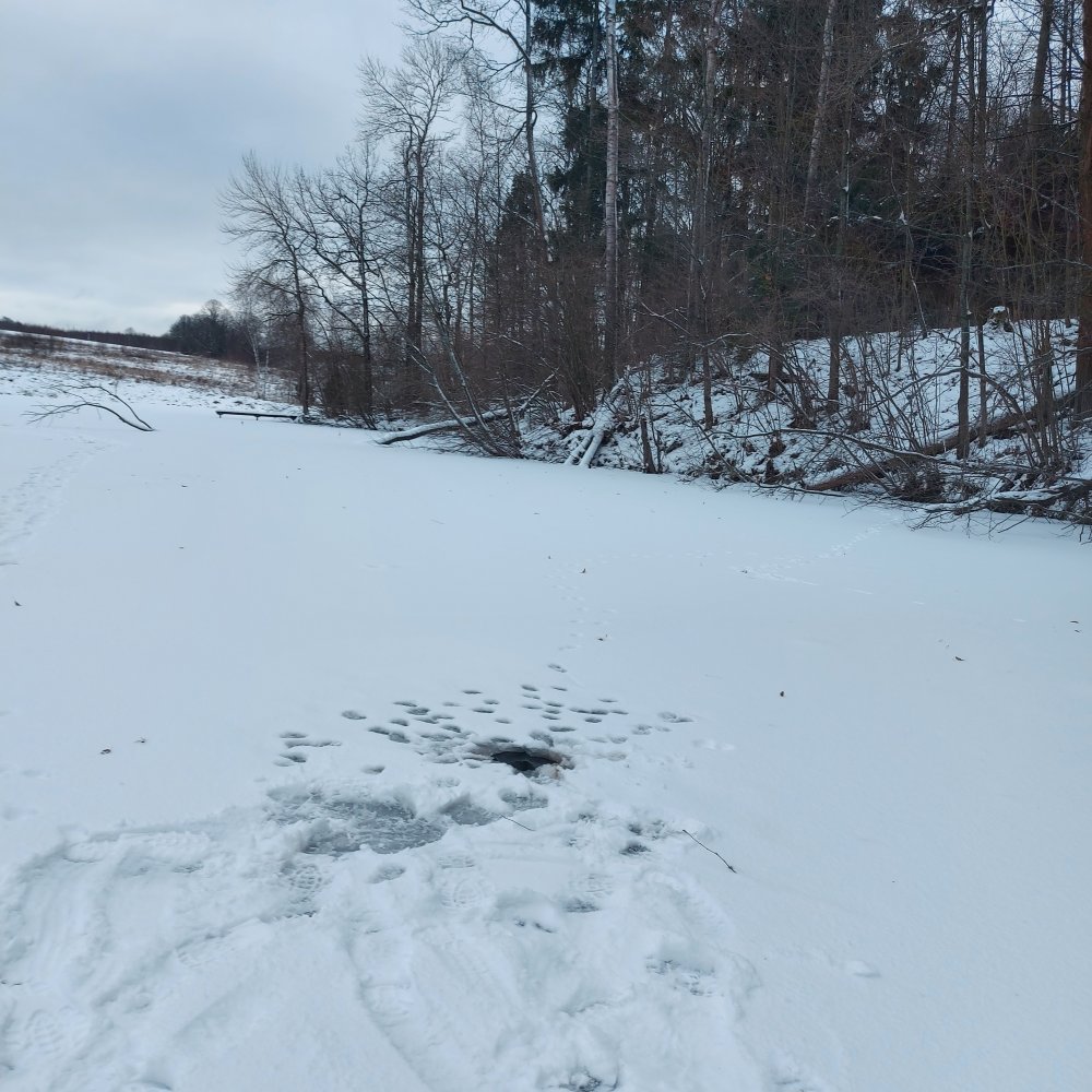 Одинцовский район, запружённая река, лёд 3 см, выходя трещит, Всем страждущим-лучше ПОДОЖДИТЕ заморозков!