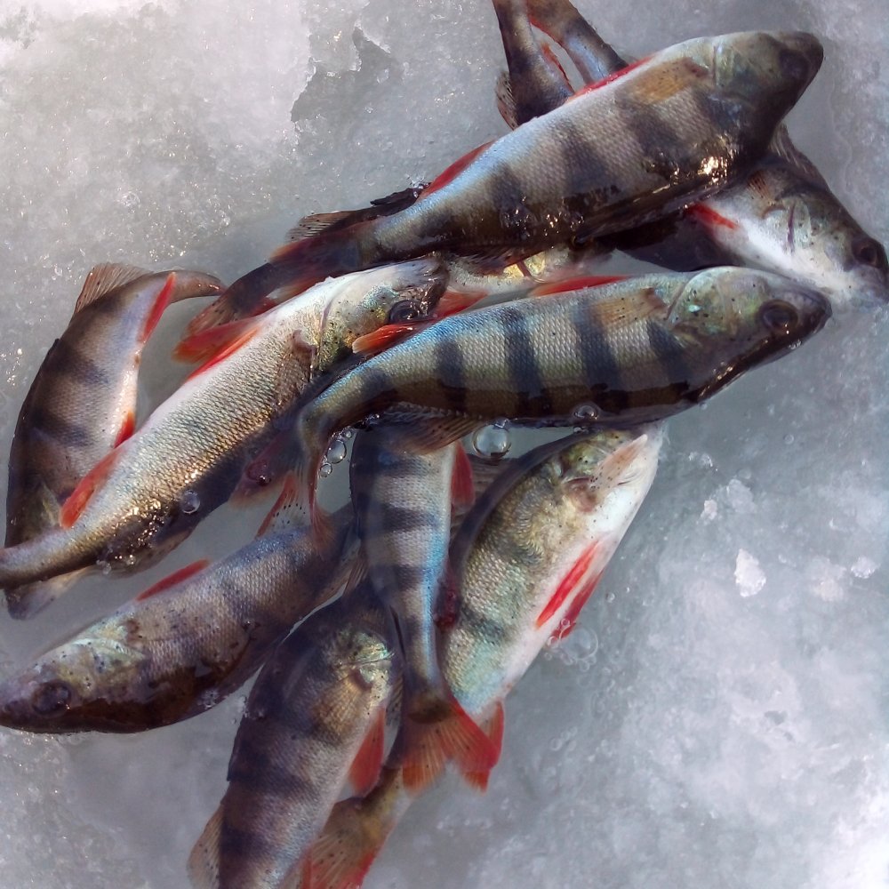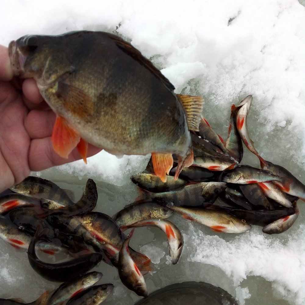 Вчера договорился на работе,сегодня день свободен.Значит куда?Правильно туда где светает. Светать начало пол восьмого,я уже на льду,ходить по слуду просто песня...грустная.Течение прёт ,где рыба должна быть знаю...но сама рыба сука, видимо этого не знает.Ходил с пешнёй,так как лёд размывает снизу и сверху,стрёмно.Прошурфив до 10-ти полсотни лунок и не найдя в них ничего кроме вот таких циклопов задумался...Решил,ни хрена я не знаю где должна быть рыба,а значит надо искать там где её быть не должно.А между тем солнышко вышло,погода во.Тут опс, первый удобоваримый окунёк ,сработал чёрно-жёлтый бисер,подсаживаю мотыля (я ж безпринципный,а с ним искать легче) ,хоп хэй ла ла лэй,пошла жара ,половина поклёвок на опускании,глубина около полутора метров ,хватает как только мормыха проходит лёд,причём окунь покрупней чем со дна.Почти каждая проводка с поклёвкой ,если две подряд без,подсаживаю мотыля,клёв возобновляется,причём червяка можно сразу выбросить. Думал,лунка золотая неа,нашлась ещё золотей ,почти полсотни штук с неё снял.Вот практически три лунки найденые в не том месте и не в то время,сделали мне красиво.Через полтора часа ,первая часть императива Канта во мне, сказала,а ну ка (сукин сын) взвесь приблизительно улов!А жаба говорит не слушай всякую умничающую куйню,лови давай!Организм подъёпывает,ну-ну тебе это всё ещё по грёбаному слуду переть. Всё!Понял!УЁБЫВАЮхожу. День удался!Чего и вам желаю! В смысле НХНЧ!