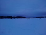 Сперва соткой нашли урез, затем в ход пошла тяжёлая артиллерия 150-го калибра, бурилось на удивление легко, я бы сказал даже с огоньком:D и к рассвету все положенные жерлицы и плюс ещё одна<:-(:D выстроились в парадном строю повторяя загиб подводного уреза... И тут "о чудо" ещё недавно пустая ледяная поляна покрылась настоящим людским муравейником, который копошился, бубнил что-то, сверлился тупыми ножами по полчаса одну лунку, но тем не менее неуклонно надвигался на наши жерличные позиции, сперва мы заметно нервничали, честно говоря ловя уже долгие годы на Большой реке я просто отвык от такого зрелища, а потом пришло просветление и я даже не стал орать на гадкого мужичёнку, который кося лиловым глазом в нашу сторону упорно бурил тупыми ножами лунку между двух моих жерлиц, что бы воткнуть туда свою, на которую и был один единственный флаг, увиденный нами в течении всего времени ловли...:bax: