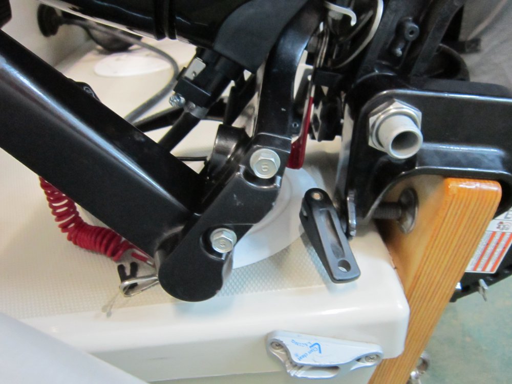 На транце стоят два рым болта, на них закреплены блоки, и двойной блок стоит на ноге мотора.