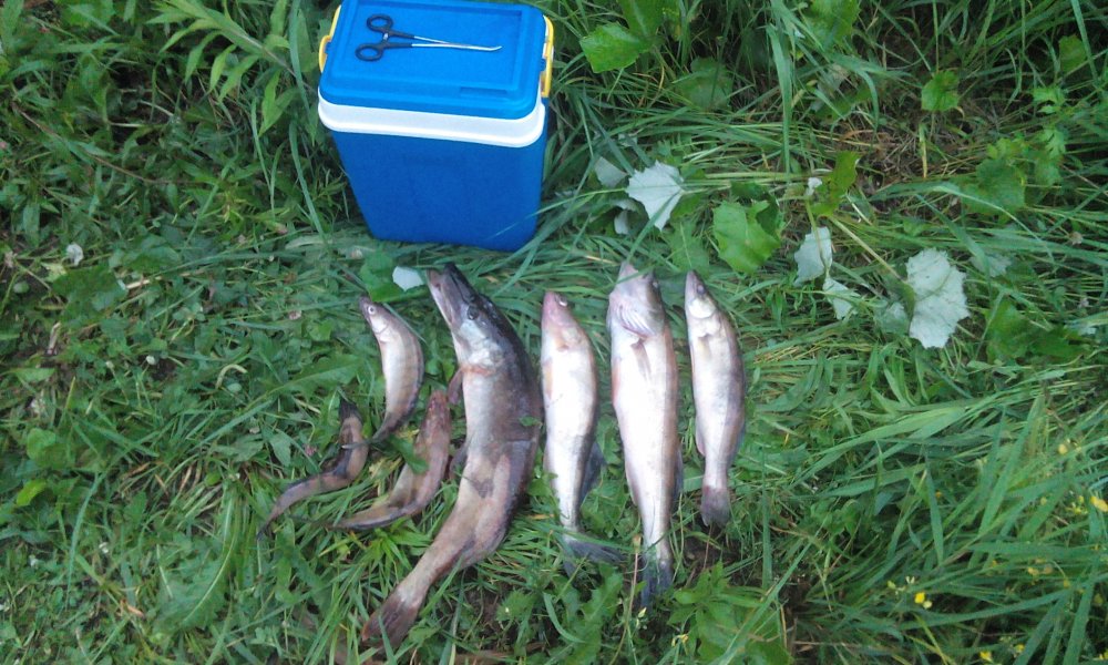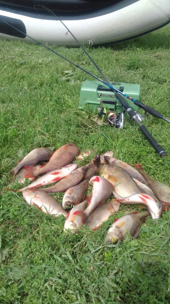 Всем доброго и здравствуйте! С пятницы на субботу снова в поисках хищных обитателей на Иваньке. В 18 на воде, с напарником :drinks: летим в поисках стоянки для ночлега :greby: Разбиваем лагерь, лёгкий перекус и даже выпадает время выйти джигануть на закате.Вечер был многообещающим, но принёс лишь несколько поклёвок и одного забортного берша. Ужин, короткий сон и в 4 утра уже летим на заветные места :buxie_v_lodke: Начинаем выстукивать дно свинцовыми грузами с разными судачьими вкусностями из резины. Несколько злых поклёвок но результативности нет.. Напарник ставит мандулу и вот первый клыкастый в подсаке. Чуть позже и я повесил мандулу. Были и забортники и щучьи срезы. Рып активничал на бровках, с 4 до 7 метров.Свинца вполне хватало 18-20 гр, ветер был хоть и сильный, но всё время менял направление от северного до северо восточного, тем самым гася образующиеся волны. Клёв продолжался около 2-3 часов и к 11 стих вовсе. Дальше смена мест, насадок, оснасток не к чему не привела. Хотя был у напарника срез на отводной. Видать щука соблазнилась. Когда окончательно надоело мыкание "в ванну",отправились на обед. Параллельно собрали лагерь и решили ещё выйти на воду, потролить. Нули.. В итоге загрузили лодку и двинулись к авто по пути троллингом . В 16 начался дождь, хотя надежды были что он так и пройдёт стороной, где то в окрестностях Твери. В общем как и пологается в дождь, на троллинг влетела щука. После небо окончательно почернело, засверкали молнии и полило уже не по детски. В общем приняли решение ускориться к дому. Сборы под дождём, все вещи насквозь мокрые :crazy: а мы довольные и счастливые :)