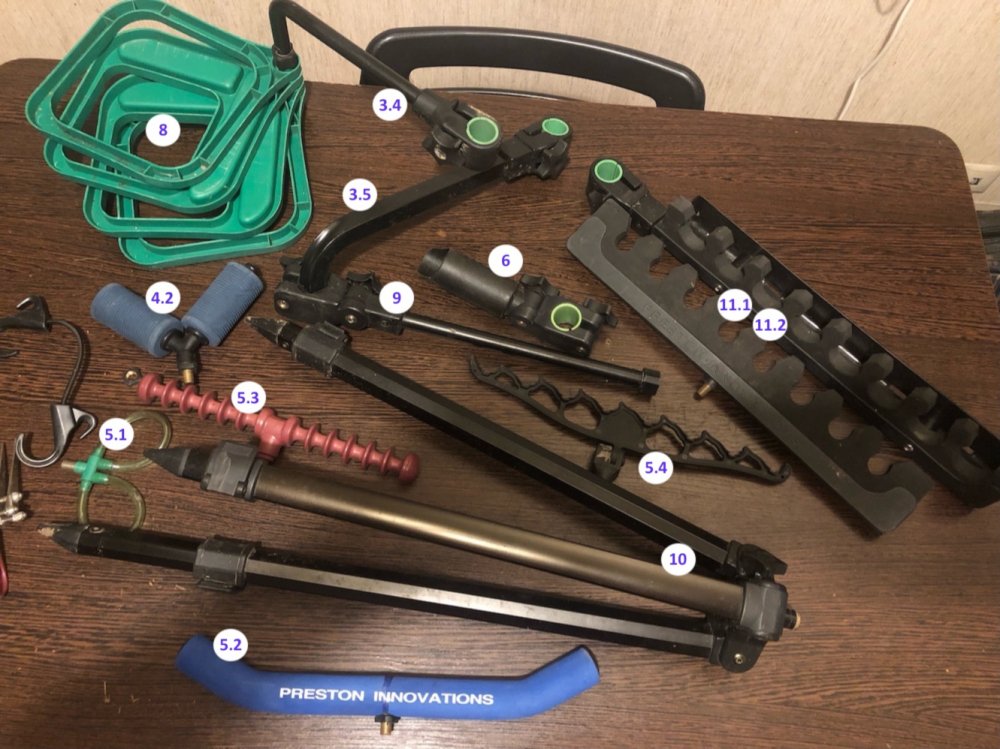 Продам личное. Полный комплект обвеса и инструментов для фидерной, карповой, штекерной/поплавочной ловли. Под платформу c ногой D25 (или для стула). Втулки переходники под круглый/квадратный профиль. Почти все фирменное Preston. В очень хорошем состоянии. В продаже дешевле в два-2,5 раза нового: 4. Ролик-подставка, 2 шт. - короткая и высокая. Цена 1500 за обе 2 шт (см № 4.1, 4.2) 5. Гребенки-подставки, 3 шт.. Цена 1500 за все 3 шт. (см № 5.1, 5.3, 5.4) 8. Столик раздвижной под контейнеры. Цена 1000 (см № 8) И + контейнеры бесплатно бонусом, если найдутся. 10. Трипод тренога телескопическая. Цена 4000 (см № 10) 12. Круглая держатель-подставка под большой таз (ведерко). Цена 1500 === БРОНЬ-1 до февраля 2024: 1. Cтойка фидер арм с телескопическими ногами. Цена 3500 (см отметку на фото - № 1) 3. Кронштейны одинарный и двойные переходники, 5 шт.. Цена 4000 за все 5 шт. (см на фото - № 3.1, 3.2, 3.3, 3.4, 3.5) 6. Стакан-держатель удилища (комля). Цена 1000 (см № 6) 9. Кронштейн-держатель фидер арм короткий. Цена 1000 (см № 9) === === БРОНЬ-2 до февраля 2024: 2. Телескоп стойка фидер арм одинарная. Цена 2500 (см на фото - № 2) 7. Подставка под удилище в неопреновой обвязке. Цена 1000 (см № 7) 11. Комплект 2 держателя удилища неопрен - под верхнюю секции удилица/и под комель, 8 посадочных мест. Цена 1500 за комплект обе 2 шт. (см № 11.1, 11.2) 5.2 Гребенка-подставка, 1 шт.. Цена 500 № 5.2 === По-отдельности, или сразу за весь комплект 23 000 руб. (скидка 1500 руб.). Цена дешевле нового в два-2,5 раза. 13. Набор инструментов для бойлов, монтажа насадок, высечки Панч Кит и ножницы для быстрой резки насадки (идеальны под нарезку червя в прикормку). Цена 1500 руб за все инструменты. Самовывоз с юга Москвы из Бирюлево-Восточного. Связь на почту shirocov@mail.ru или в телеграм @duo_608 Весь обвес под все условия ловли полностью собирался и подходит для Платформы Trabucco и стула Korum - в продаже здесь: https://www.fishing.ru/talks/threads/3271/