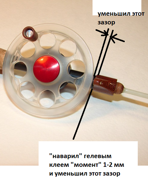 Уменьшил расстояние, "наварил" слой гелевым клеем между катушкой и типа втулкой, где проходит отверстие для пропуска лески на хлыст. Зазор стал минимальным, практически впритык, леска перестала сбрасываться и путаться , сейчас нормально. А так-то по первости использования тоже психовал над этой проблемкой :bax: , в руке-то удочка лежит шикарно, очень удобно. Сейчас у меня любимая чертилка. :)